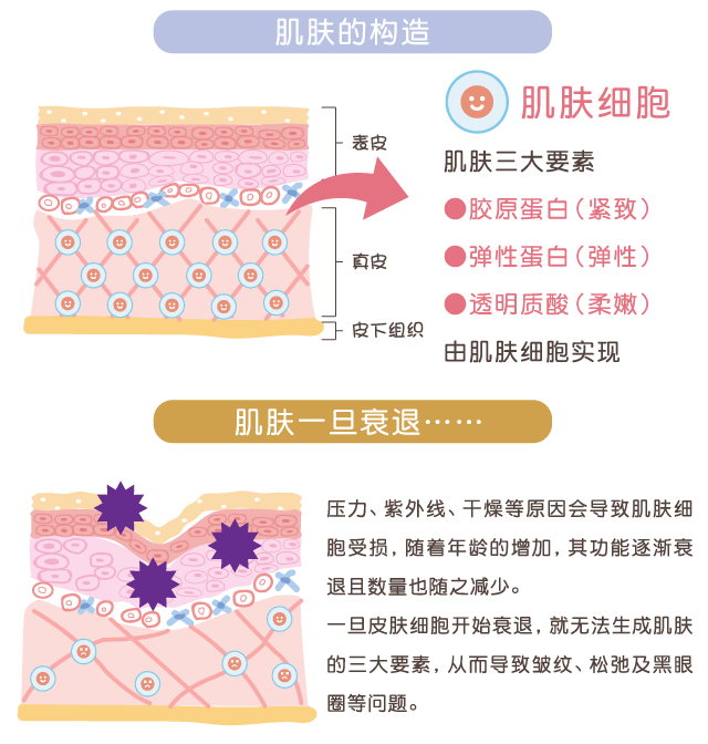 所谓“皱纹”“皮肤下垂”,其根本原因就是皮肤的老化,而老化就是形成皮肤的细胞质量降低以及量的减少。对此,注射玻尿酸虽然可以修整“皱纹”“皮肤下垂”的表象,但不能解决皮肤细胞减少这个老化的根本原因。