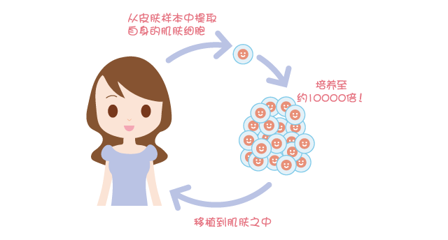 所以,使用皮肤细胞的再生医疗是对因老化而减少了的皮肤细胞进行移植和补充,起到真正改善“皱纹”“皮肤下垂”的效果。此项皮肤细胞移植和补充疗法,不会如玻尿酸那样通过扩张皮肤表面的凹沟来修整“皱纹”“皮肤下垂”,而是从导致“皱纹”“皮肤下垂”的根本原因着手,解决皮肤老化(细胞减少)的问题,从而改善“皱纹”“皮肤下垂”。